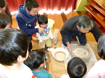 ゲーテ先生が、日本昔話に出てくるような石臼を持って来てくれました。畑でとれた小麦を石臼で引いて、全粒粉を作ります。子どもたちは興味深々で石臼を眺め、回してみるのに挑戦。「重~い」