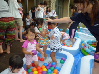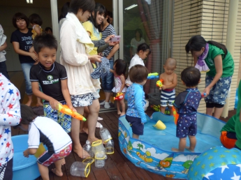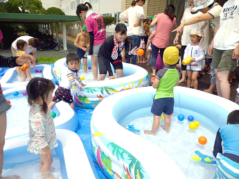 7月27日に真夏のこどもむらが開催されました。これは、こども健康学科のお兄さんやお姉さんが企画運営する楽しいイベントです。昨年に続き、こどもむらの真ん中に手作りプールが出現しましたよ!穴を掘って、ブルーシートを引いて、学生達が汗にまみれて作りました!!