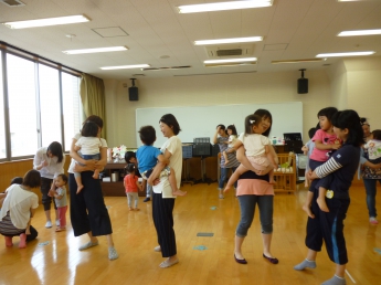 広いお部屋で親子ビクスに挑戦しました。親子で楽しむエアロビクスです。