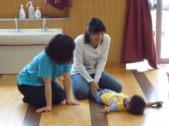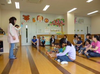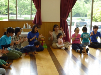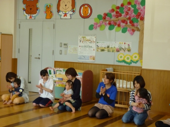 指人形の時間があったよ。お父さん指、お母さん指、お兄さん指、お姉さん指、赤ちゃん指・・みんなのお洋服をお洗濯。洗い終わったお洋服は正しく着れたかな?お父さん指が赤ちゃんのお洋服を着てる。すると「ちがう~」「それでいい~」「おかしい~」「あってる~」子ども達も声が飛び交います。みんなよく見てたね。えらい!!