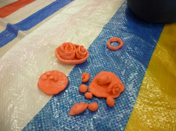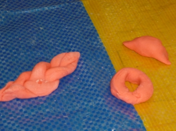 今日は室内遊びで「小麦粉粘土」をしました。小麦粉に塩と食紅を混ぜて水を加えて練り込みます。