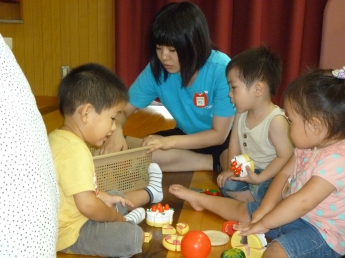 男の子もおままごとが好き。トントン切って遊びます。もうすぐおいしいのができま~す。