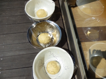 ラップをかけて、暖かいひなたに出して発酵を待ちます