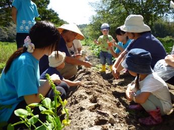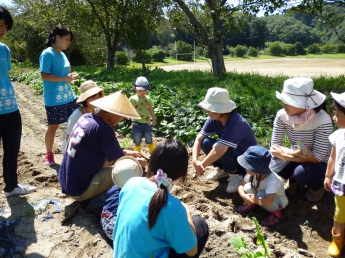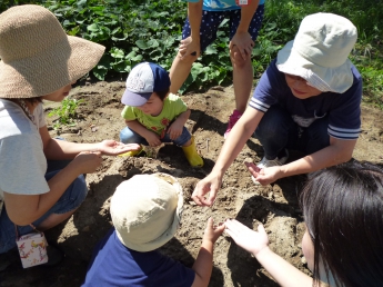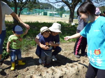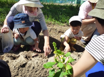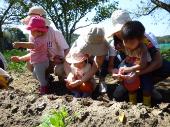 発酵を待つ間、こどもむらの畑に行って大根の種まきをしました。