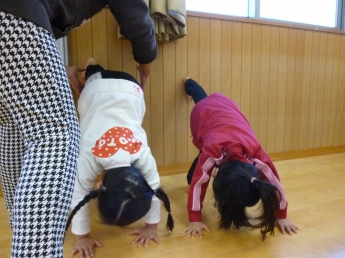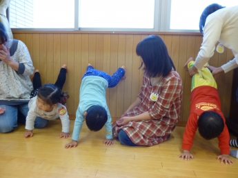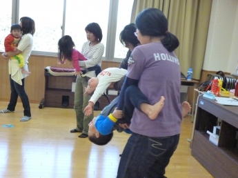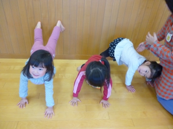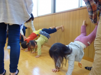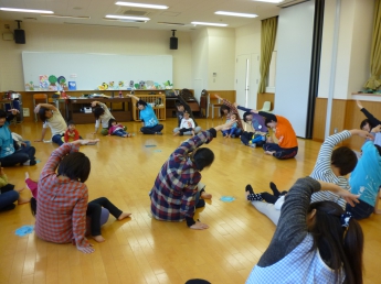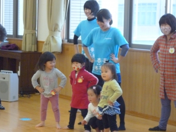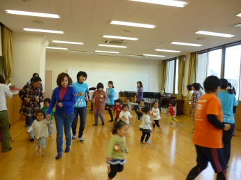 今日は大きなお部屋で親子ビクスです。ママ達に頑張って動いていただく日です。日頃の運動不足を解消していただけると幸いです。
