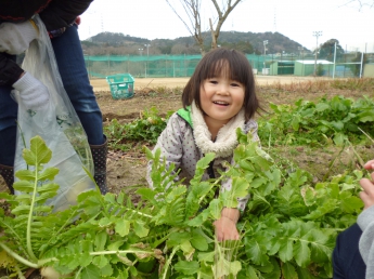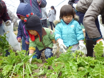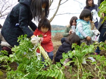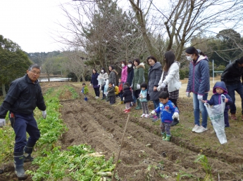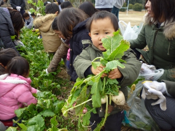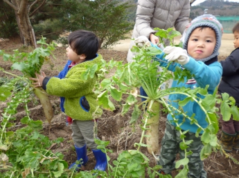 普段見慣れた白く太い大根の他に小さな大根・赤い大根・緑の大根などなど、大根と一口に言っても色々あってびっくり!袋を持って長靴はいて、さあ、こどもむら畑に向かって出発~!