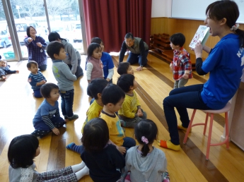 「くだもの」の絵本を読みます。きちんと座って聞けるかな?