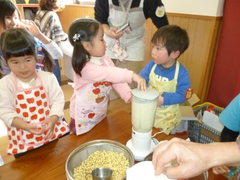 ゲーテ先生が手順を説明してくれます。ママも子ども達もエプロン姿でやる気満々。前の晩から水に浸しておいた大豆は、お水を吸ってまん丸から、楕円形に変身。それを水と一緒にミキサーでペースト状にすり潰します。