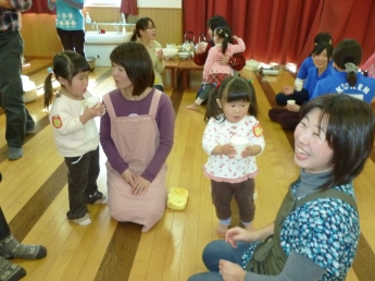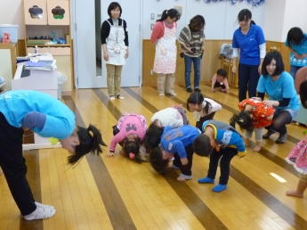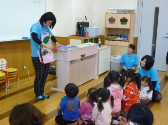 搾り汁を温めている間、こども健康のお姉さんがエプロンシアターを見せてくれました。”はらぺこあおむし”のお話です。