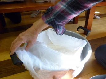 温まった豆乳に”にがり”を入れて、布をひいた型に流し込みます