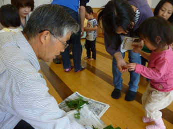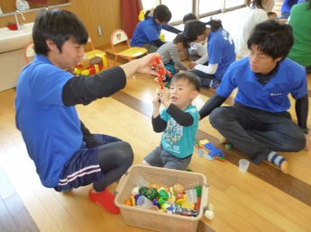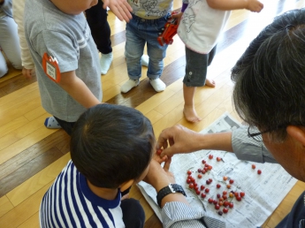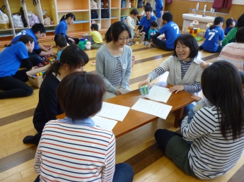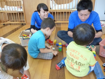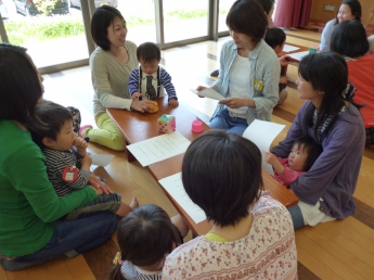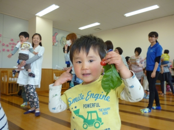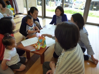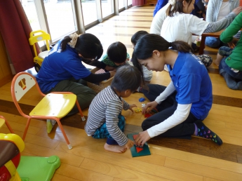 本日1回目は、「お友達になろう」です。新しいメンバーと昨年に引き続きのメンバー、みんなで楽しく過ごす時間作りをします。まずは自由遊びから。ママのおひざから周りを眺める子、どんどん一人で行ってしまう子、お兄ちゃんやお姉ちゃんに興味のある子、欲しいおもちゃが使えなくて泣けちゃう子・・・色々な経験や体験から、子ども達は成長していきます。成長が楽しみですね。