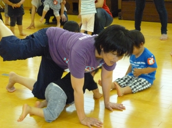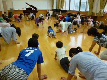 ママが四つん這いになって運動しているところをトンネルに見立てて、子ども達がくぐります