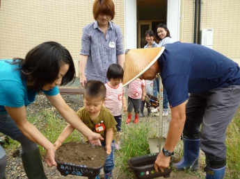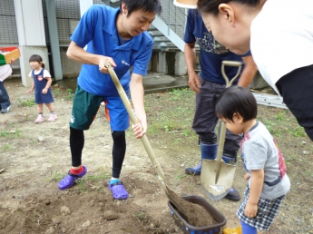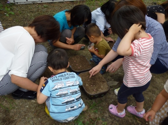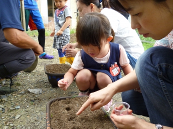 ゲーテ先生と野菜の種まきをしました。まず、ゲーテ先生から野菜の説明と植え方の説明を聞きます。