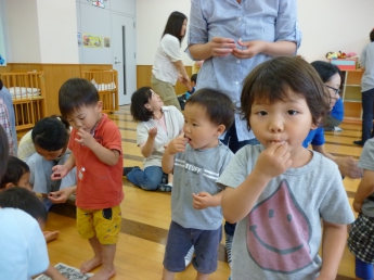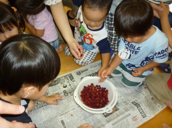 初めて食べるよヤマモモの実。ちょっぴりすっぱいけど、おいしい~。幼児期に色々な味に触れることは味覚の幅を広げます