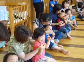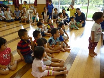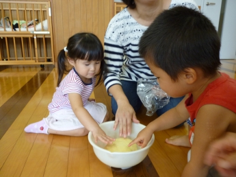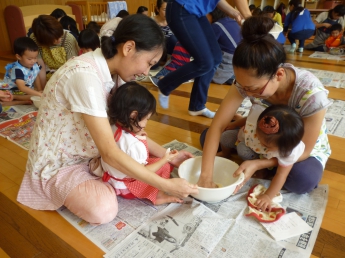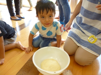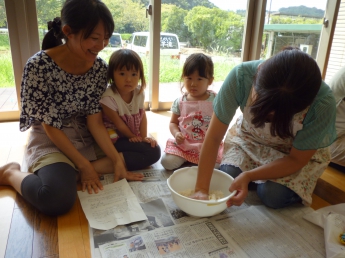 パンの発酵時間が必要なので、すぐにパンの生地つくりに取り掛かりました。「ママ~がんばれ~」子どもたちの声援が飛びます。