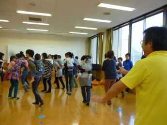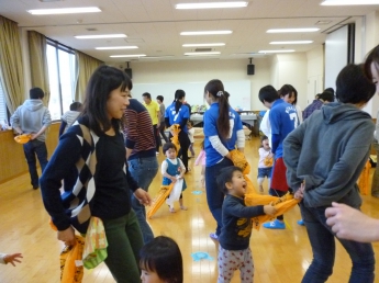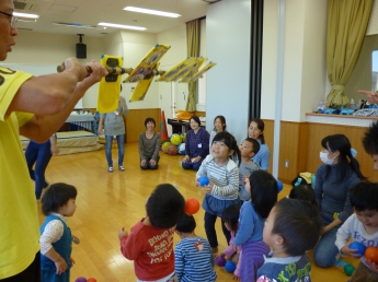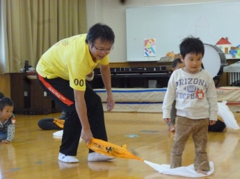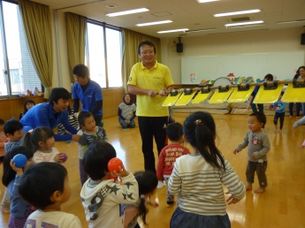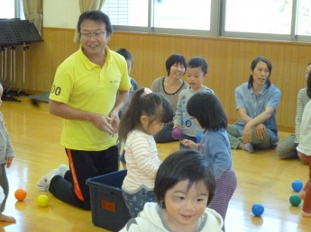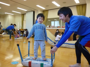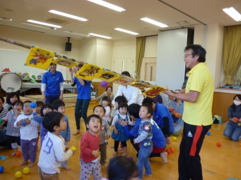 今月は室内で楽しむゲームや運動遊びがテーマです。講師はこども健康学科で学生達に”運動遊び”をご指導くださっている磯谷先生。通称”スッパマン先生”です。