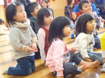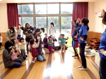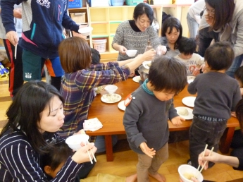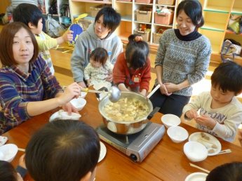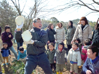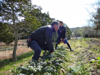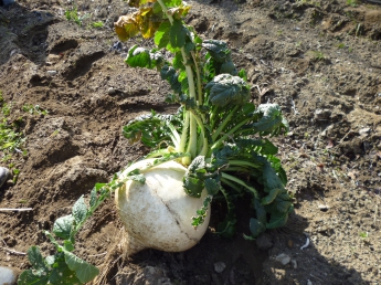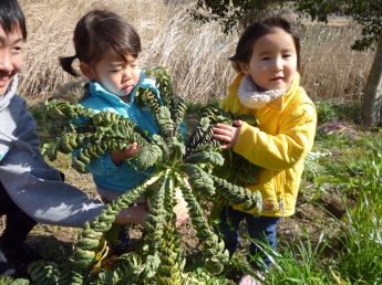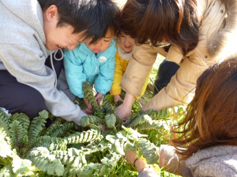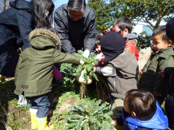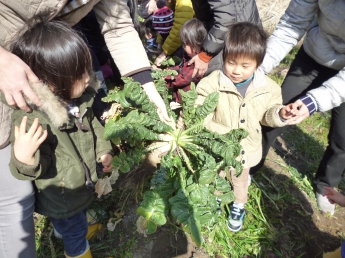 こどもむら自然体験エリア畑の桜島大根が大きく育ちました。今日は収穫とすいとん汁にしていただきます。