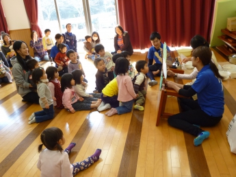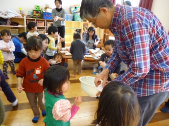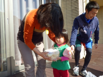 ゲーテ先生が収穫した桜島大根引換券を配ります