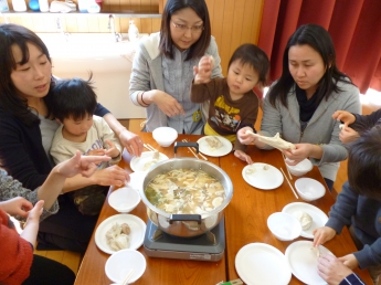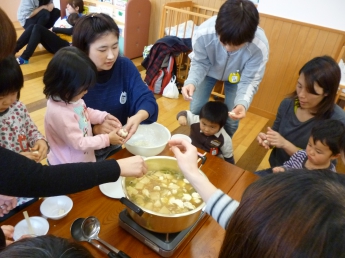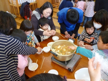 だんごを作って、ちぎって、丸めて、つぶして入れます