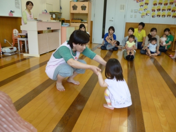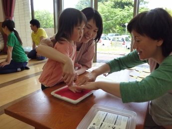 今日はお誕生会があるので、先に手形をとります。お手てにインクをペッタン。素敵なお誕生カードを作りましょう