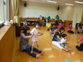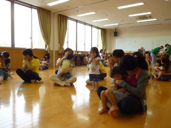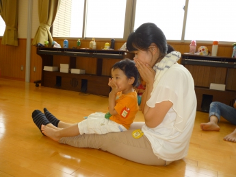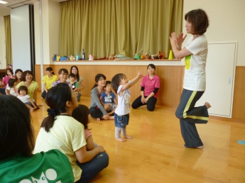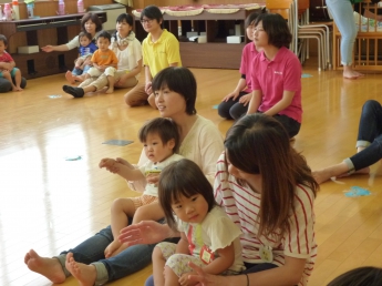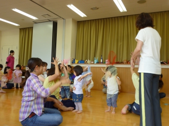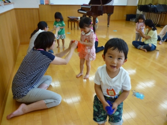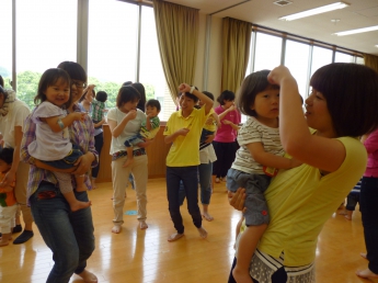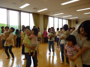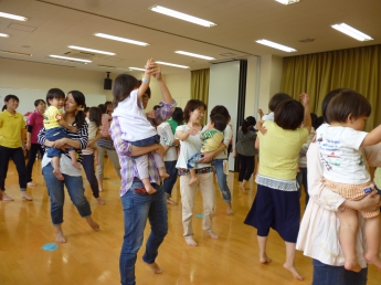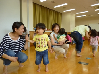 捕まえた!音楽に合わせてお母さんは子どもを捕まえます。捕まってもうれしいね。楽しい時間はあっという間に過ぎました
