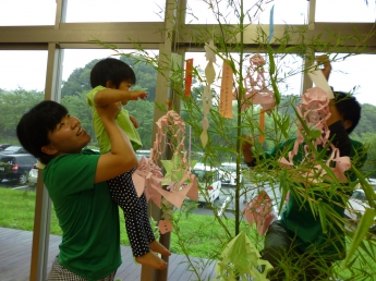 お姉さんに抱っこしてもらい、竹に短冊をつけました