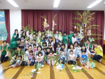 素敵な七夕飾りができました。みんなで集合。はい、チーズ。