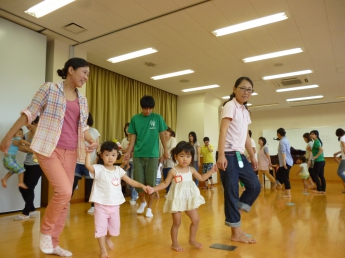 リズムに合わせて歩きます。お友達と手をつないで。段々とお友達と楽しさを共有することを学習していきます
