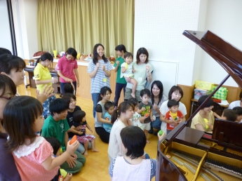 果物の形のマラカスで加藤先生のピアノに合わせてリズムをとります