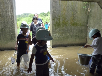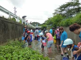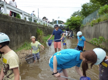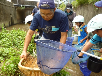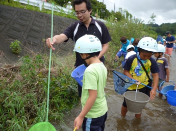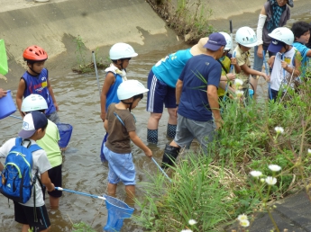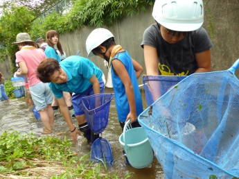 都田川の支流である大学周辺を流れる川に入って、実際に生き物に触れる勉強です