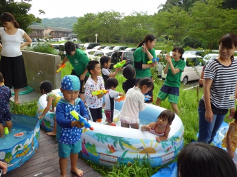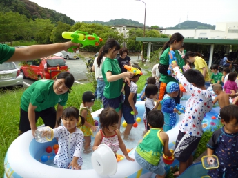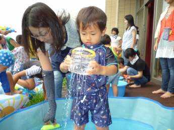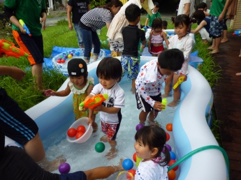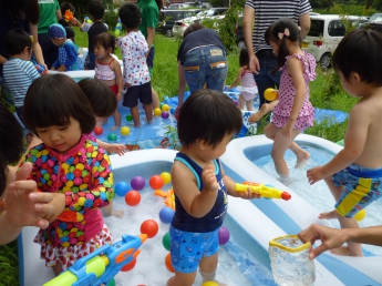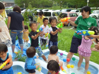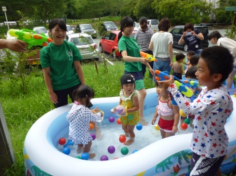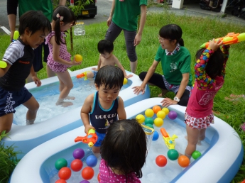 夏休み前、最後のポッケです。すでに夏休みになっている幼稚園のお兄さんやお姉さんも参加して、思い切り水遊びをしました。ポッケルーム前のウッドデッキや芝生に大小様々なビニールプールを置いて、水鉄砲も用意して、水着に着替えてさあ、始めましょう