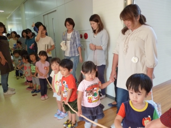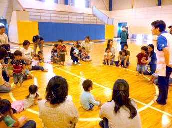 体育館に行く前に、10月のお誕生会も行いました。ニコニコ顔で先生のインタビューに答えます。