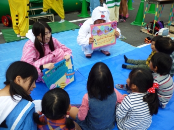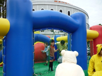 ふわふわブース。お姉さんから安全に遊びルールを聞きます