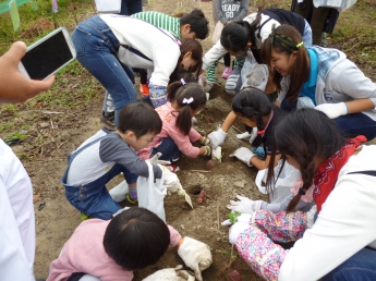 芋堀りブースで農業体験。大きなお芋、採れたかな?