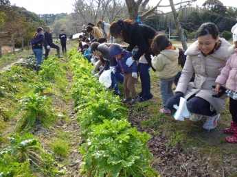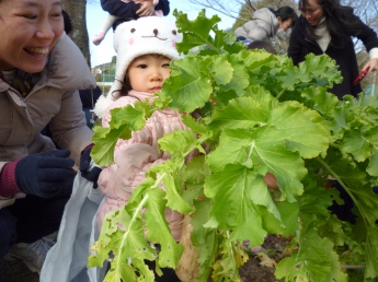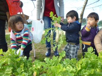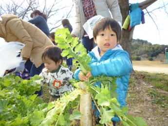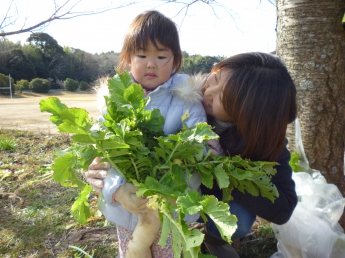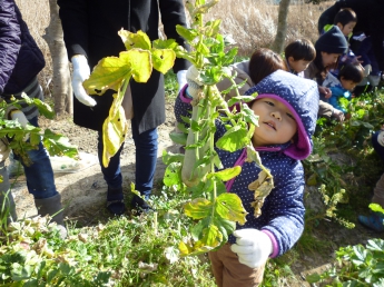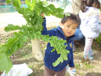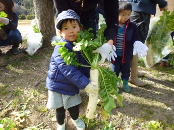 畑の大根が大きく育ちました。ゲーテ先生から、大根の種類や栄養・調理のお話を聞いてから、今日は畑に大根収穫に出かけます。白い大根だけでなく、緑の大根・赤い大根・長細い大根・太い大根・・・いろいろな種類があるんですね。