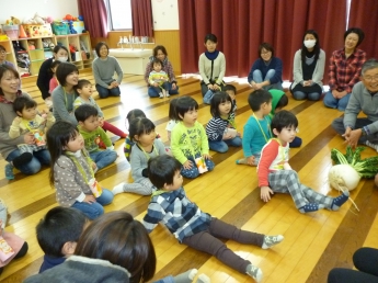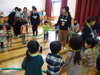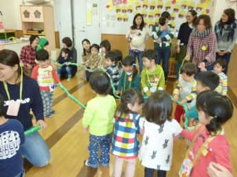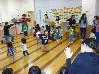 始まりはお姉さん先生達と”にじのむこうに”のダンス。もう、すっかりダンスの振付も覚えてリズムに乗って踊ります。みんなで踊ると楽しいね。