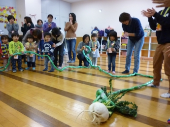 みんなで力を合わせて引っ張るよ。うんとこしょ、どっこいしょ