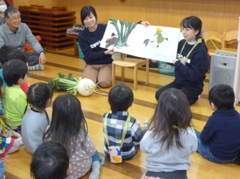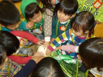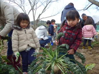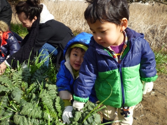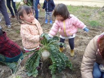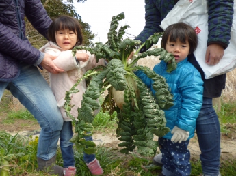 畑で収穫。うんとこしょ、どっこいしょ。うわあ~、大きいのとれたよ!