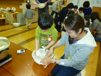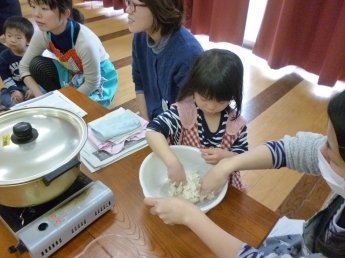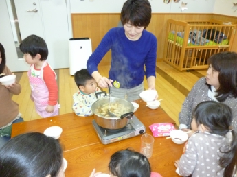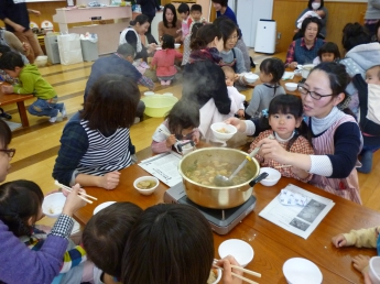 みんなの作ったそば粉入り小麦粉団子が入っています。今日は米こうじから作った甘酒も飲みました。