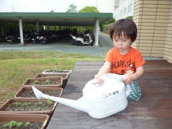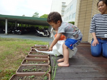 先週の教室で蒔いたプランターの種。どうなったかな?「わあ、芽が出てる~」うれしいね。みんなのプランターに、ちゃんと、かわいい葉っぱが出ているよ。お水をたっぷり、あげましょう。
