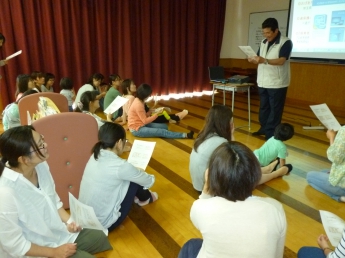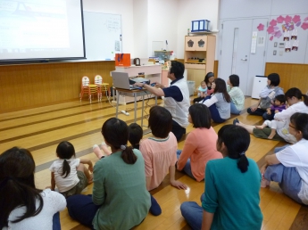 今日はベテラン保育士まあちゃん先生の親子ふれあいタイムと、こども健康学科長・海野先生の子育てお役立ち講話です。まあちゃん先生は現役ベテラン保育士で、わらべ唄遊びの達人です。