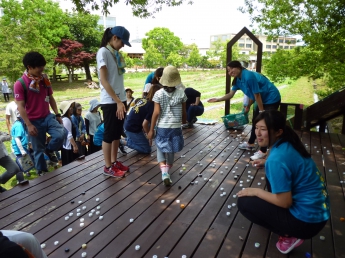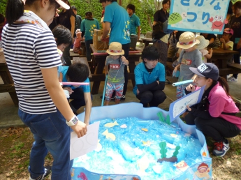 ”こどもむら”は年4回、こども健康学科の学生が企画・運営する子どもたち参加型のイベントです。大学内の自然体験エリアや教室を使って、ゲーム方式や手作り体験ブースで子どもたちと学生が楽しい時間を過ごします。今回は海の生き物を主人公に子どもたちを楽しませる内容でした。