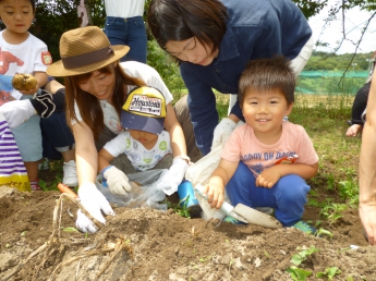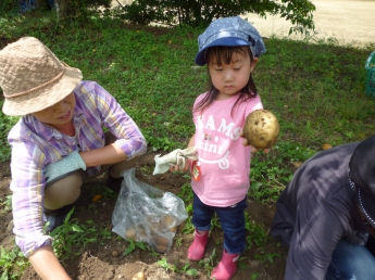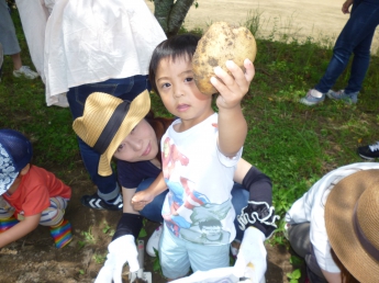 梅雨の合間の貴重な晴れに、みんなで”こどもむら自然体験園”でじゃがいも堀りをしました。