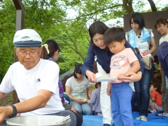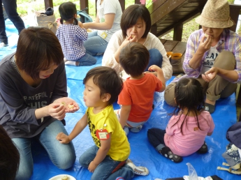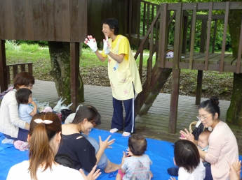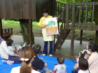じゃがいも堀りの後は、ツリーハウスに移動してマユミ先生の手遊びタイム