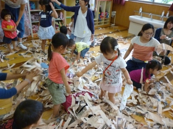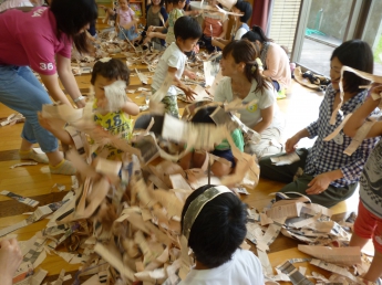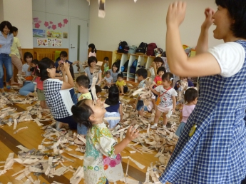 破いた新聞を「それっ~」と上に向かって投げます。新聞がフワフワ?バサッと?落ちてきます。それだけなのに、なんか楽しい。お母さんも楽しそう