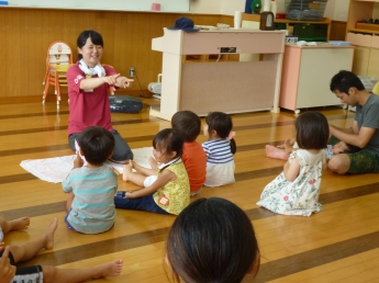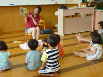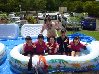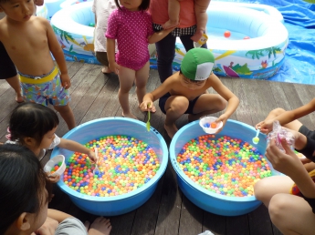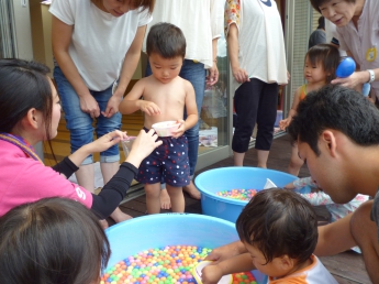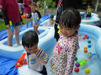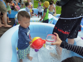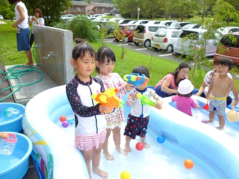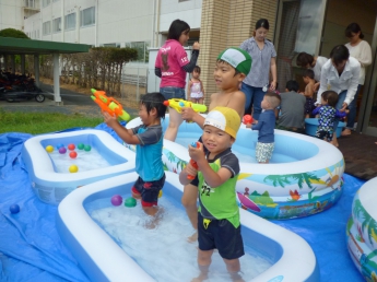 ビニールプールをいっぱい並べて、今日は思いっきり水遊びしましょう。お休みなので、小学校や幼稚園のお兄さんやお姉さんも一緒です