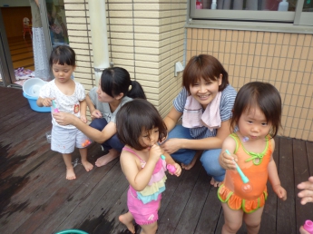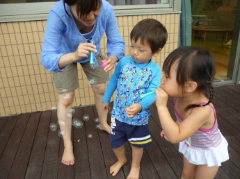 水着だから、思いっきり濡れても平気。シャボン玉をいっぱい飛ばしました
