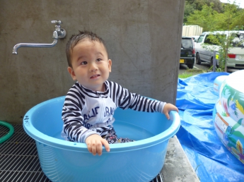 たらいに入って一人ご機嫌。おしりで水の冷たさを十分に楽しみます