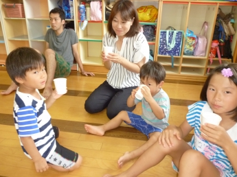 水遊びの後は、ゲーテ先生が作っておいてくれたシソジュースでのどを潤します。綺麗なワインカラーのジュースです