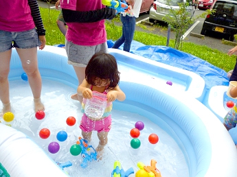 お姉ちゃんも一緒で楽しそう。水にカラーボールが浮かんでいると楽しい気分